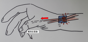 親指を伸ばす腱が使いすぎなどで腫れ腫れて、腱が通るトンネル(腱鞘)に引っかかり痛みが出た状態です。