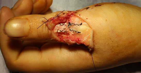 伸筋腱を強固に縫合しました。電気ノコで受傷すると組織の欠損が生じます。腱の欠損が3-4mm生じておりました。